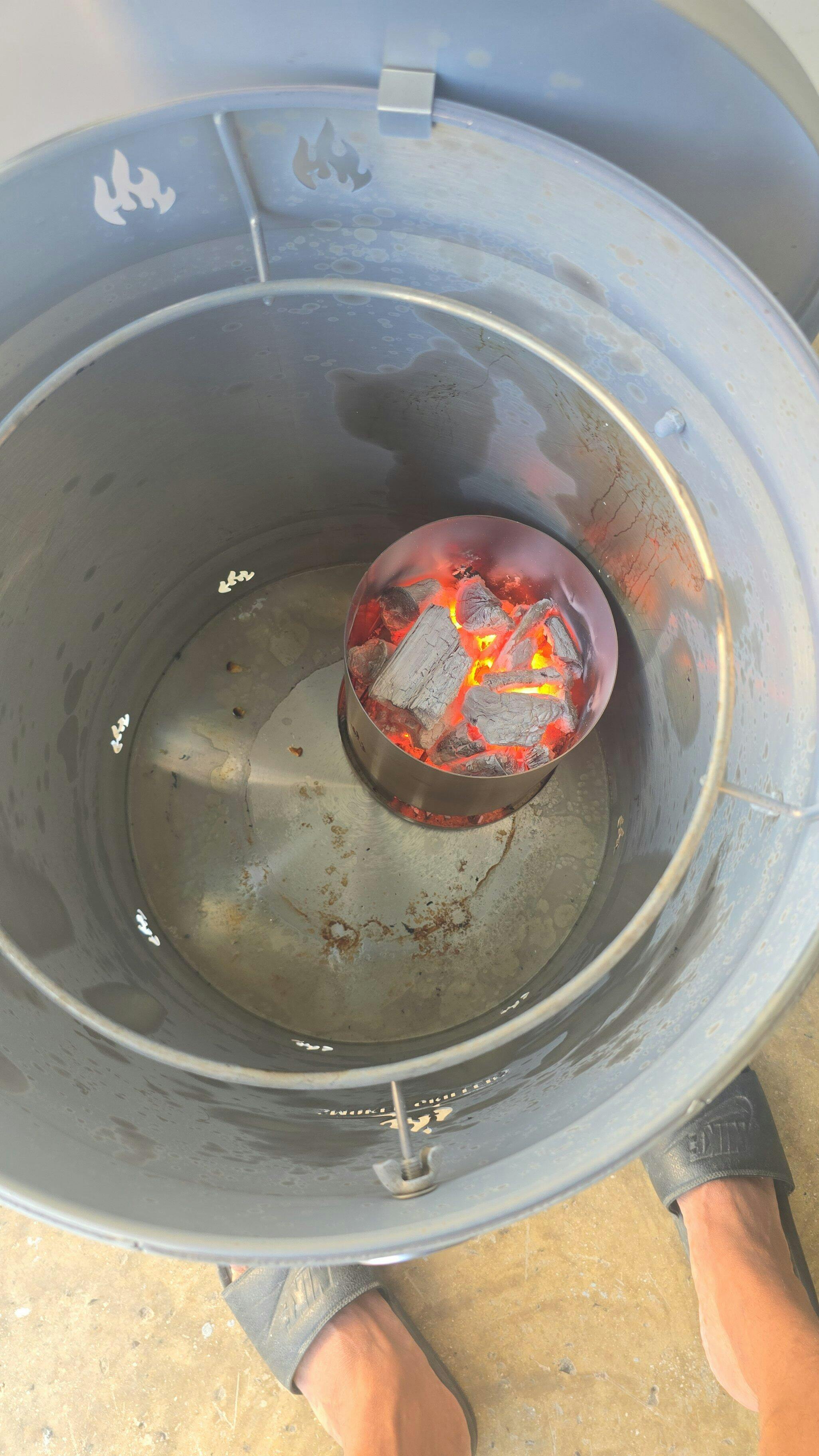 Setting up your barrel grill is simple: Line the base with aluminum foil for easy cleanup, add sand or beer with spices for extra flavour (optional), fill the burner with charcoal, and light it using oil-soaked paper towels or fire starters. Once the charcoal is ready, insert the cylinder, hang your meats, and close the barrel. Pro Tip: Keep the lid closed to maintain even heat. -