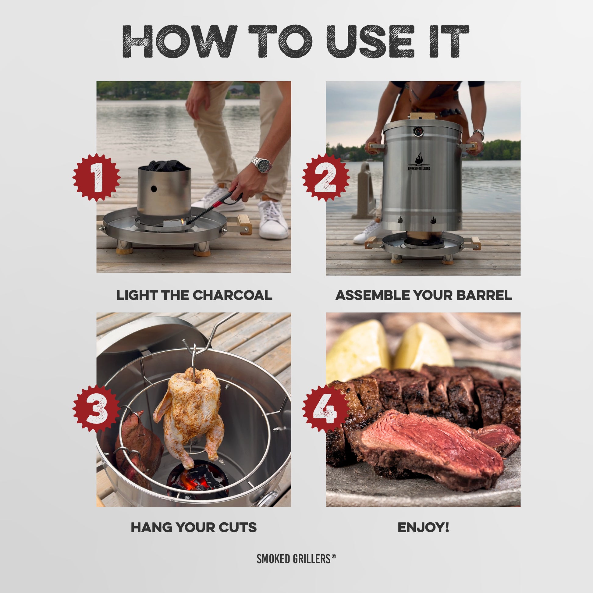 Setting up your barrel grill is simple: Line the base with aluminum foil for easy cleanup, add sand or beer with spices for extra flavour (optional), fill the burner with charcoal, and light it using oil-soaked paper towels or fire starters. Once the charcoal is ready, insert the cylinder, hang your meats, and close the barrel. Pro Tip: Keep the lid closed to maintain even heat. -